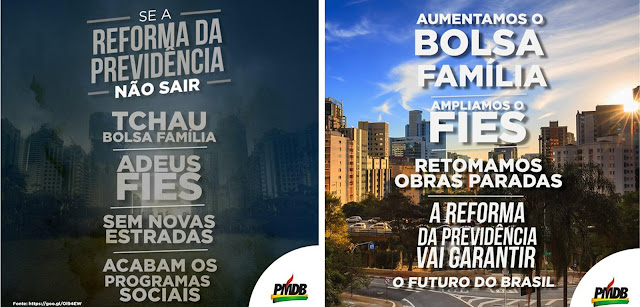 | Peças publicitárias do PMDB relacionam reforma da Previdência à continuidade dos programas sociais (Foto: Reprodução) |
